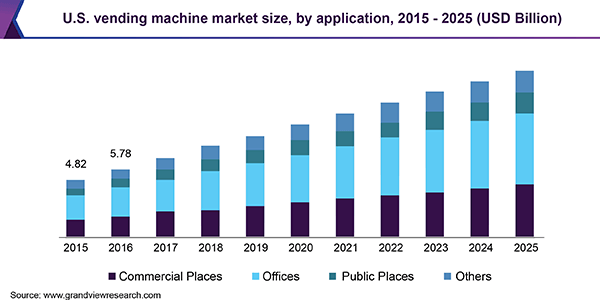The vending machine market can be segmented into commercial places, offices, public places and others based on the application of the machine. Although, these machines are extremely profitable at places like railway stations, bus stations and airports, the largest market share is taken in the office sector and it is the fastest growing segment over the time. These machines are used in offices to save space and costs. The office sector is increasing day by day as seen in the figure above.