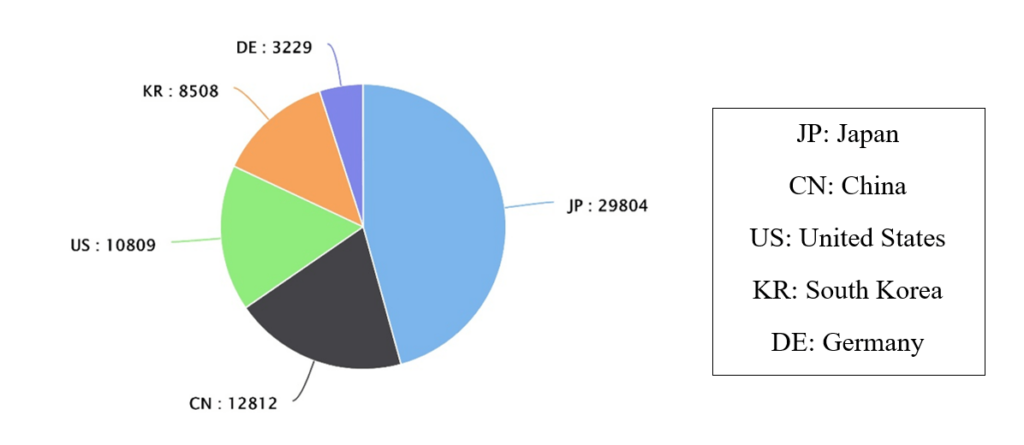 The figure represents the top five countries filing patents for vending machines. The tech-hub Japan is leading the innovation race of the vending machines, with around 50% of the patents filed there. There is a rat race between United States and China with difference of just 2000 patents.
