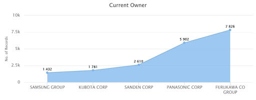 The area chart represents the top 5 companies which filed patents for vending machines overall. The Furukawa Company Group of Japan is the top filer followed by Panasonic Corp and Saden Corp.