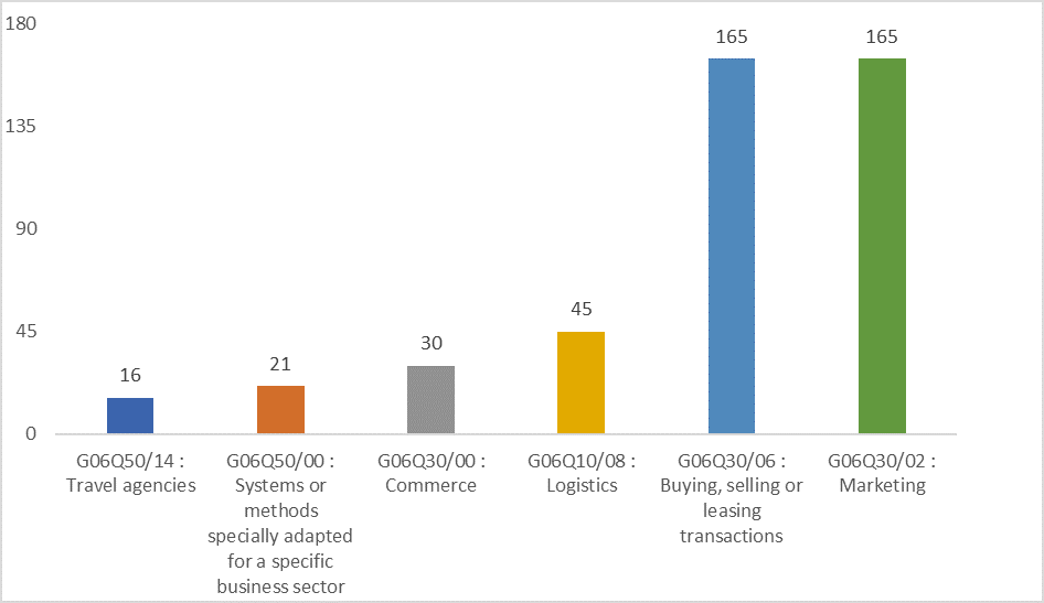 The bar plot represents the patents filed for personalization using big data and predictive analysis in e-commerce. Predictive analysis and big data largely help in personalization, includes the patents in various classes like travel agencies, logistics, and special methods adapted for a specific business. It is observed that the majority of the patents are filed in the marketing and buying transactions domain.
