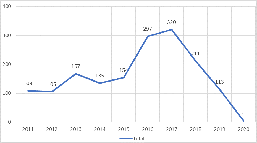 The above line chart represents the patents filed on E-commerce technology. Many patents have been filed in e-commerce technology since 2011. The number however significantly decreased by 2019.